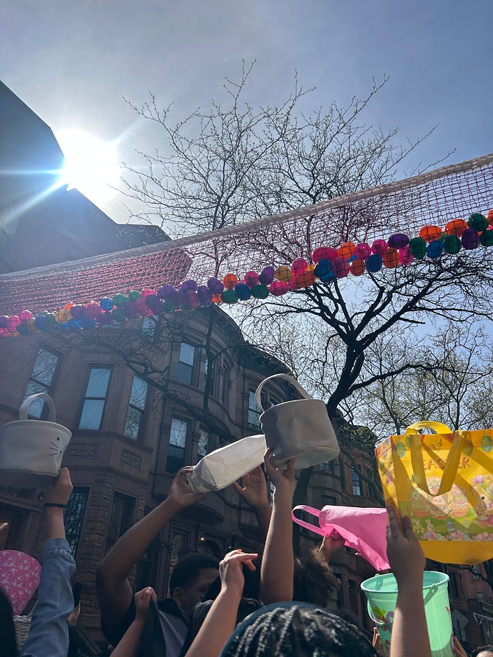 Each year, we head to this street for the hunt. Usually, the organizers hide the eggs in the nooks and crannies of brownstone steps and landings. They also scatter them around tree beds and planter pots. But this year, they tried something new—all the eggs were hoisted in above-head nets anchored by opposing tree trunks on this tree-lined street. Each year, when our children set out to find their eggs, at least one if not two kids come back disappointed by how few eggs they've collected. I've watched each time this happens—the kids who are committed to getting their eggs trample our younger kids and other less-aggressive kids to do that very thing: fill their baskets with eggs. Our kids set off with hope and excitement until a faster hand swoops down and snatches the egg before they can. They head to the next egg only for the same thing to happen again. I'm always cheering them on to hunt and grab faster, but often their hopes are dashed with no eggs left to find.
